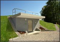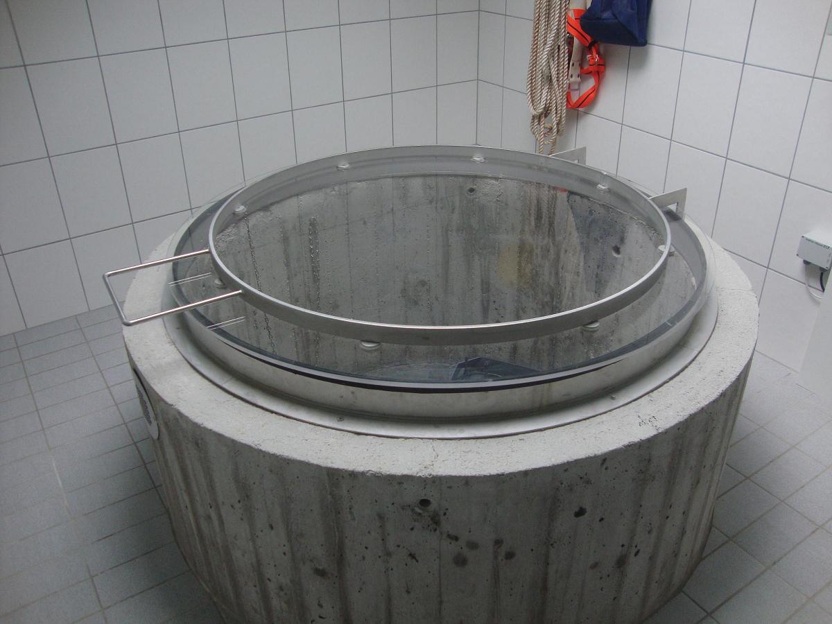 Die Aussenansicht des Hochbehälters Schaltschrank mit der Alarmzentrale Eines der beiden Speicherbecken Schieberkammer mit Rohrleitungen