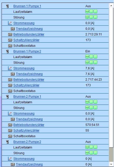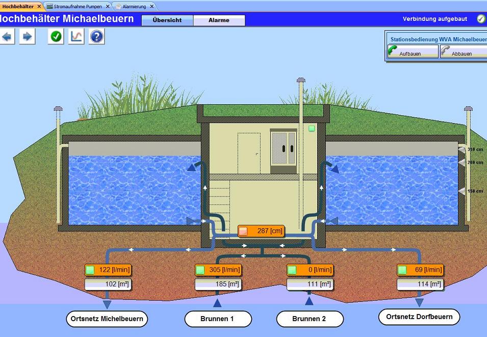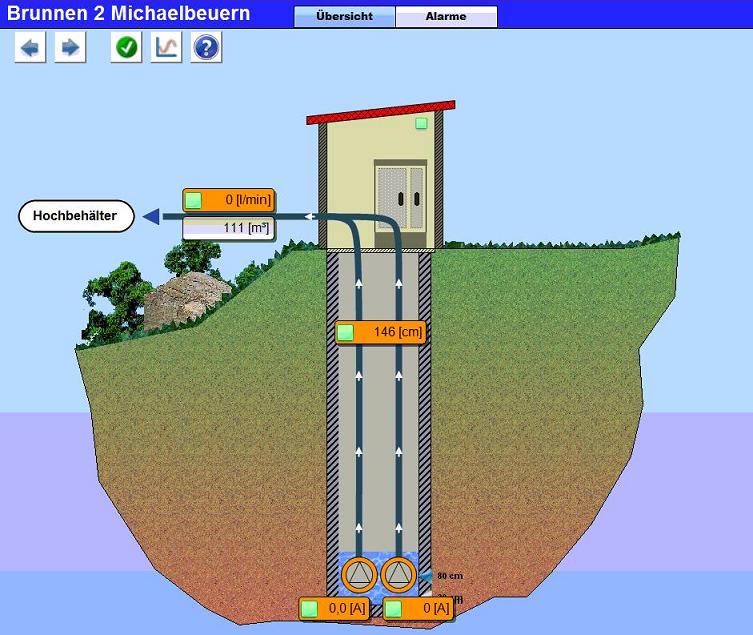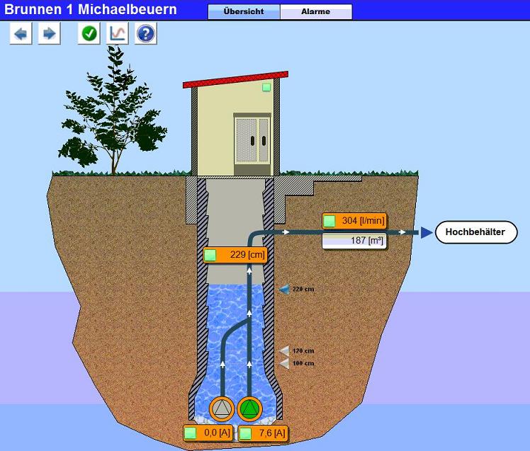 Schaltbild Hochbehälter Schaltzustände der Anlage Schaltbild Brunnen1 (Schachtbrunnen) Schaltbild Brunnen2 (Bohrbrunnen) Dynamische Anzeige von Betriebszuständen (Ein/Aus/Störung) für alle Maschinen